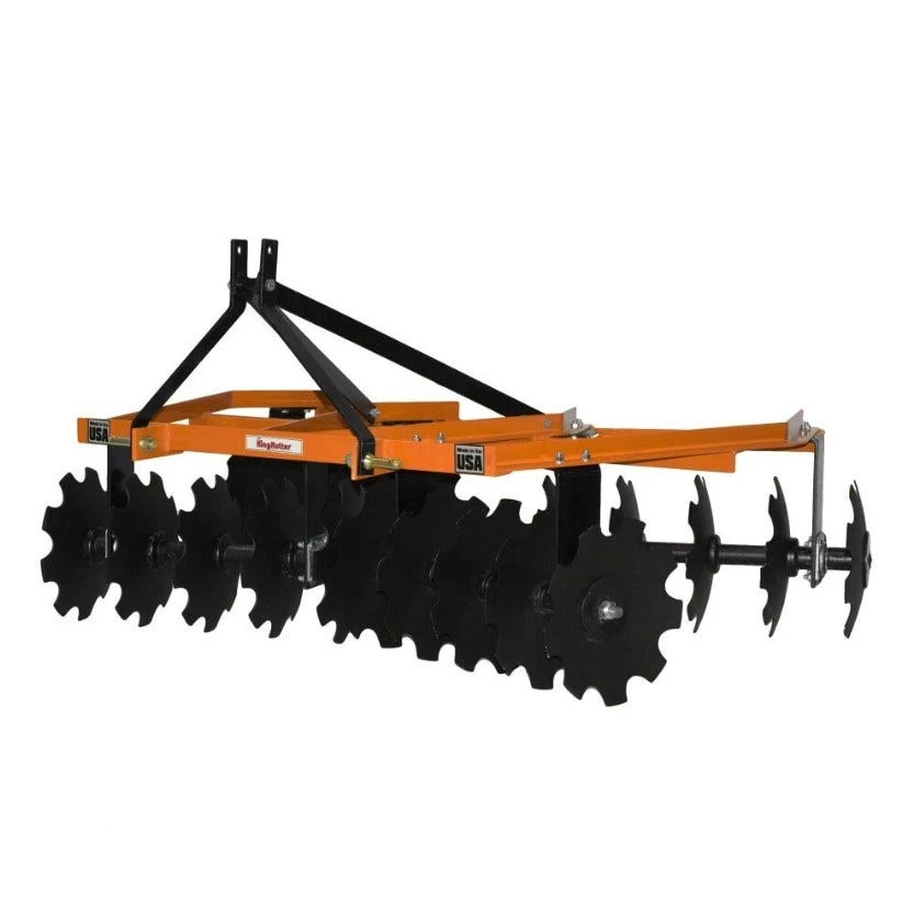 KING KUTTERS PROFESSIONAL ANGLE FRAME DISCS are constructed with heavy rigid angle iron. It connects easily to any three-point hitch with category one specifications. The disc gang axles are made of 1″ square steel rods mounted on double thrust ring gray-iron bearings. All disc harrows have angle adjustments of 10 or 15 degrees. The 5 1/2′ discs have two adjustments and the 6 1/2′ has three.